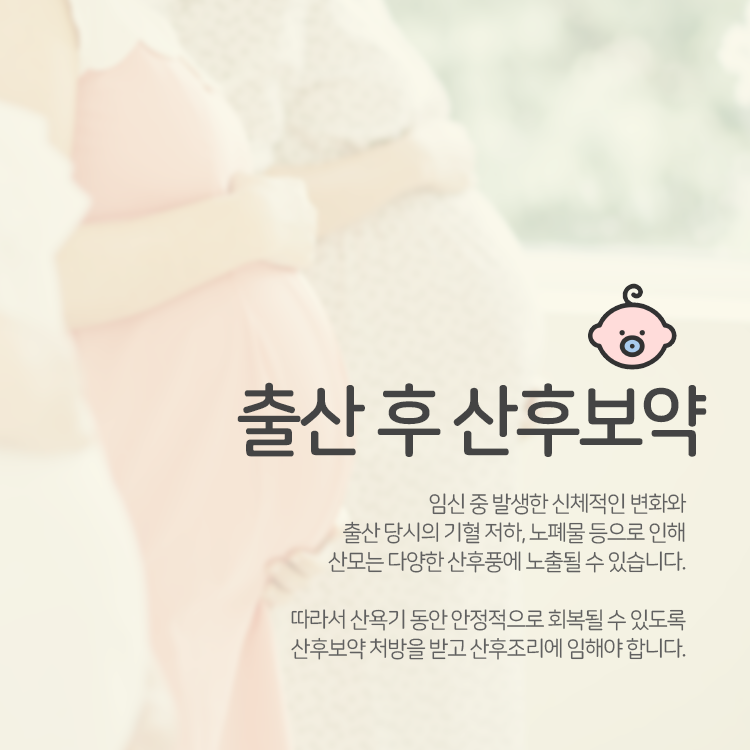 산후보약은 다양한 부분에서 도움을 전해 줄 수 있는 방안이라고 생각을 하시면 되겠습니다. 기본적으로 어혈의 제거를 도와주며 근골격이 강화되어 건강한 상태를 찾아가는 데에도 도움이 되어 줄 수 있을 거라는 말씀을 전해드릴 수 있겠습니다. 이외에도 부종의 개선 효과를 함께 돕고 있는데요. 출산 후 달라진 체형이 또 다른 고민거리가 되기 충분한데 이런 때에 마찬가지로 회복 효과를 기대하실 수 있는 거라고 말씀을 드립니다. 다스리기 어려운 심신의 상태를 자연스럽게 다스리면서 건강한 모습을 찾아가실 수 있을 거라고 말씀을 드립니다.