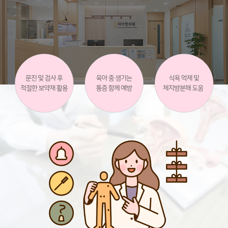 임신과 출산의 기쁨 속에서도 산모의 몸은 착실히 약화되기 마련입니다. 임신 기간 동안 발생한 신체, 심리적 변화와 출산 시 과도한 기혈의 소모가 그대로 남아 문제를 일으키게 될 수 있습니다. 이것을 당연하고 자연스러운 일이라 생각하며 곧장 육아와 집안일, 기존의 업무로 복귀하려는 여성분들도 계신데 이는 잘못된 생각입니다.