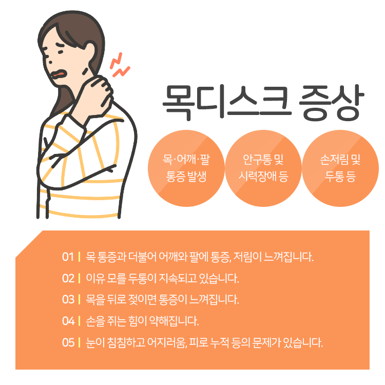 두통이 찾아오게 될 수 있고 집중력이 떨어지고 눈이 침침해지는 것도 목디스크와의 연관성을 지녔습니다. 이처럼 다양한 증세들로 하여금 정상적인 생활을 영위하는 게 점차 어려워진다는 생각을 하게 됩니다. 따라서 초기 치료를 통해 회복을 도모할 수 있도록 해야 합니다.