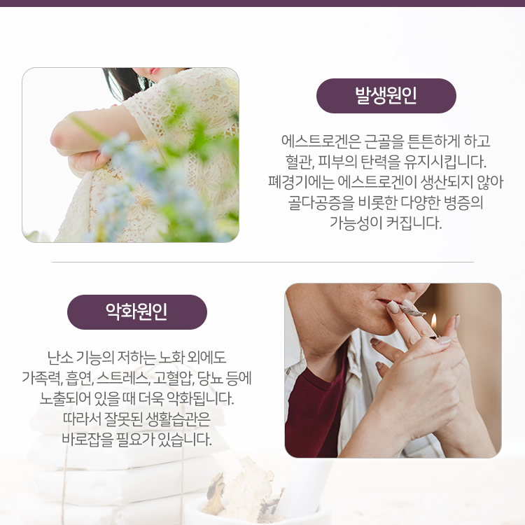 갱년기를 조금 더 의학적으로 이야기해 보자면, 난소 기능이 감소하며 여성호르몬의 분비가 줄어드는 시기라 생각해 주시면 되겠습니다. 구체적인 시기는 정해져 있지 않으나 주로 45세~55세 사이에 갱년기가 진행이 된다고 여겨지고 있습니다. 여성이라면 어쩔 수 없이 누구나 겪게 되는 일이라고는 하나, 그럼에도 불구하고 울적함과 더불어 무서운 느낌까지 드는 것은 막을 수 없으셨을 것인데요. 그렇기 때문에 더욱 지친 마음을 끌어올리며 심신의 회복을 위한 노력을 기울여 주어야 하는 것이라고 강조해 말씀드리고 싶었습니다.