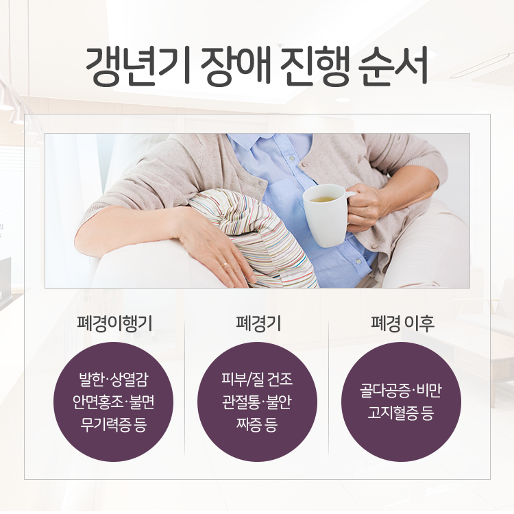 갱년기는 시기에 따라서 조금씩 다른 증상을 유발한다는 게 특징이라 생각해 주시면 되겠습니다. 먼저 완경 전기, 즉 간헐적으로 월경을 하는 시기에는 주로 얼굴이 빨개지는 안면홍조 증상과 수면장애, 기분 변화, 짙은 피로감, 집중력 저하 등의 문제가 찾아옵니다. 아직까지는 수면장애를 제외하고는 심각한 문제라고 여겨지지 않을 수 있으나 이때부터 시청역갱년기 관리를 해 두는 게 중요합니다.