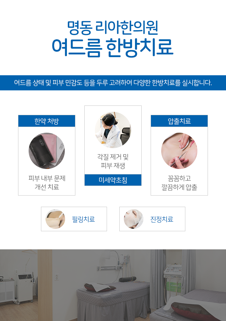 여드름으로 인해 돌출이 된 트러블 부위는 가려지지도 않고, 심지어는 시간이 흘러도 금방 사그라들 기미마저 보이지 않아 큰 고민거리가 될 수 있었는데요. 그렇기에 이에 대한 치료를 통해 회복을 도모하는 것이 중요한 과정으로 작용할 수밖에 없다는 말씀을 드릴 수 있었습니다. 명동야간진료한의원 명동 리아한의원에서는 여드름의 상태를 고려하여 면포성인 비염증성부터 염증성 여드름까지 치료를 도와드리고 있습니다. 또한 여드름의 자국이나 흉터에 대한 관리도 함께 이루어지고 있기 때문에 여드름이 올라오는 상황에 곤란하셨던 분들이라면 내원을 하셔서 관리까지 도움받을 수 있도록 신경 써 주시기를 바라겠습니다.