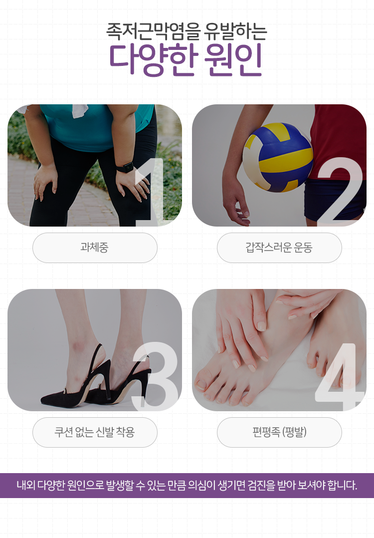 평소 운동량이 많은 분들이라면 안정적으로 달리기를 진행하는 게 어렵지 않겠으나 이제 막 운동을 시도해 보시는 분들께서는 발바닥 근막이 변화에 적응하지 못해 쉽게 손상이 생기기도 합니다. 또한 평소에 충격 흡수가 부족한 딱딱한 신발을 자주 착용하거나, 발 아치를 지지해 주지 못하는 불안정한 신발을 오래 신을 때도 족저근막에 부담이 누적될 수 있습니다. 체중 증가 역시 발바닥에 가해지는 무게를 늘려 족저근막염의 위험 요인이 된다는 점도 설명드릴 수 있습니다.