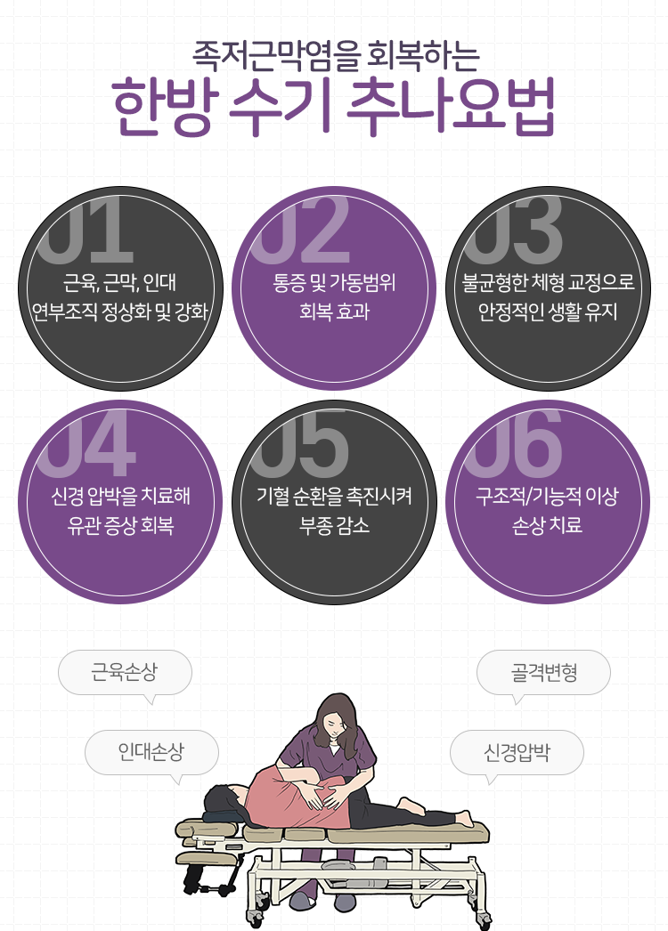 그렇기에 치료를 통해 명동족저근막염 회복을 도모하는 것이 중요하다고 말씀을 드립니다. 본원으로 내원을 하시게 되면 족저근막염의 상태를 확인 후 한의학 치료를 통해 회복을 도와드립니다. 내부의 상태를 자세히 진단받아 보실 수 있으므로 발바닥 통증을 야기하는 다양한 질환의 가능성을 배제하지 않은 채 상태를 살필 수 있으며 그에 따른 치료가 이루어져 안정적인 회복을 도모하실 수 있을 거라고 설명을 드립니다. 약침요법, 침요법, 물리치료 등을 병행한다면 통증을 다스리고 건강한 회복 효과를 기대하실 수 있을 것이라고 말씀을 드립니다.