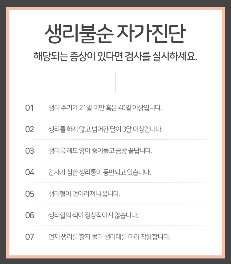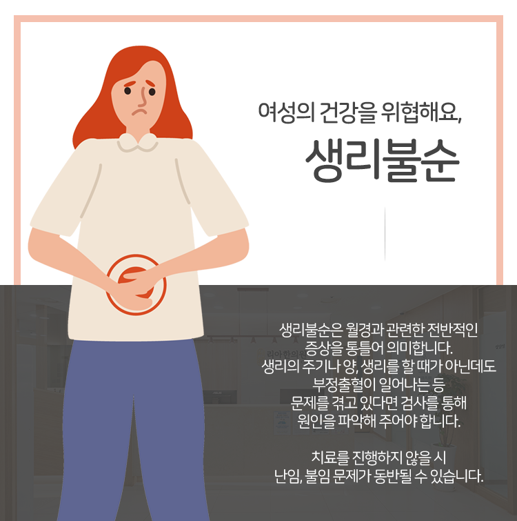 여성분들께 생리불순 문제는 흔한 일로 여겨지고 그렇기에 심각한 상황이라는 생각을 하지 못한 채 넘어가는 경우도 많이 있는데요. 하지만 자궁 기능이 약해졌음을 알려오는 신호인 만큼 이에 대해 적극적인 관리를 진행하실 수 있도록 해 주어야 한다고 말씀을 드렸습니다. 당장에는 심각한 문제처럼 보이지 않을 수 있겠으나 나날이 악화가 되면서 전반적인 몸 건강에도 타격을 줄 수 있는 것이 부정출혈, 생리불순 문제라는 점을 기억해 주시길 바랍니다. 감사합니다.