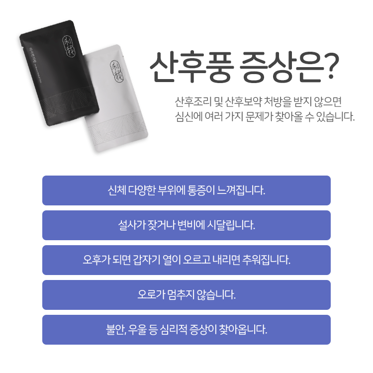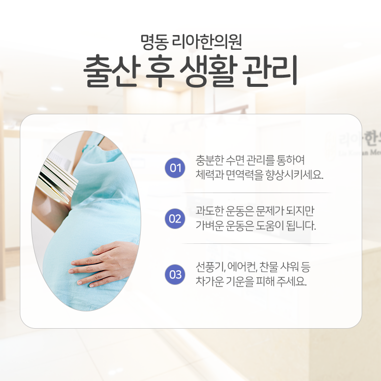 출산을 하고 난 다음이라면 생활 속에서도 언제나 꾸준히 관리하실 수 있게 노력을 기울여 주셔야 했는데요. 충분히 잠을 자면서 체력과 면역력 향상을 위한 노력을 기울여 주는 게 바람직한 태도라 할 수 있겠습니다. 또한 과도한 운동은 몸이 약해진 상태에서 오히려 더 상태를 악화시키는 데 비해 가벼운 운동은 건강에 도움이 되므로 산책 등을 꾸준히 해 주시는 건 좋은 방향성으로 나아가는 것이라 생각하시면 됩니다. 그밖에도 찬바람, 선풍기, 에어컨, 찬물 샤워 등 차가운 기운을 받는 일이 없게 삼가 주는 것도 중요하니 함께 신경 써 보시길 바랍니다. 감사합니다.