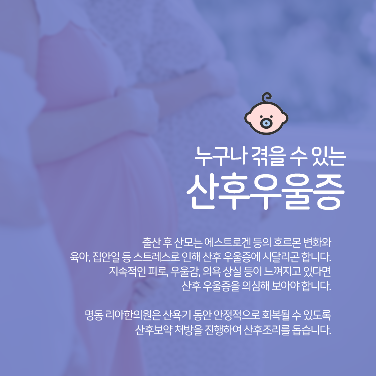 이는 개인의 그릇된 감정이 아니라 출산 후라면 누구나 겪을 수 있는 산후우울증 때문이라고 생각을 해 주셔야 하겠는데요. 그렇기에 명동 리아한의원 을지로산후우울증한의원에서는 관련한 치료를 통해 건강한 생활을 다시 찾아갈 수 있도록 노력하는 게 중요하다는 점을 말씀드리고는 하였습니다.