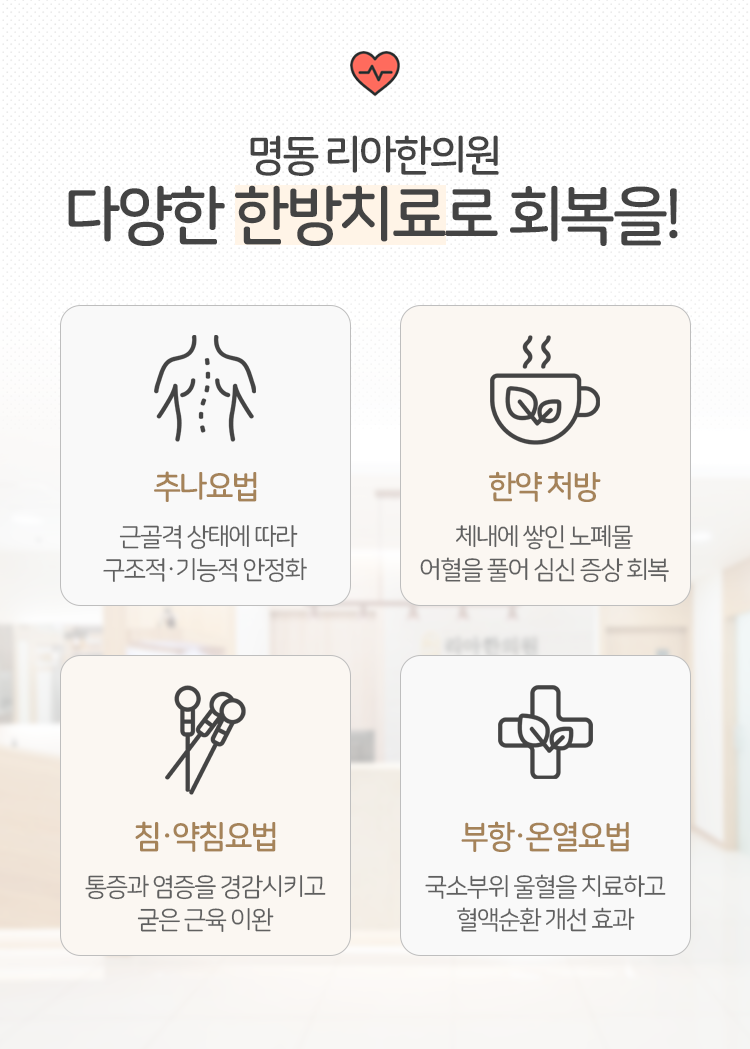 그렇기 때문에 명동기침치료한의원에서는 기침의 원인을 살피고 또 얼마나 오랜 시간 지속되었는지 등을 확인하면서 치료까지 도움을 전해드리고 있었는데요. 만성적인 기침을 개선하기 위해서라면 그저 겉으로 드러나는 증상 억제에만 신경 쓰고 넘어갈 게 아니라 내부에사 발생한 불균형 상태까지도 면밀하게 파악해 주는 게 현명한 일이 된다고 말씀을 드렸습니다.