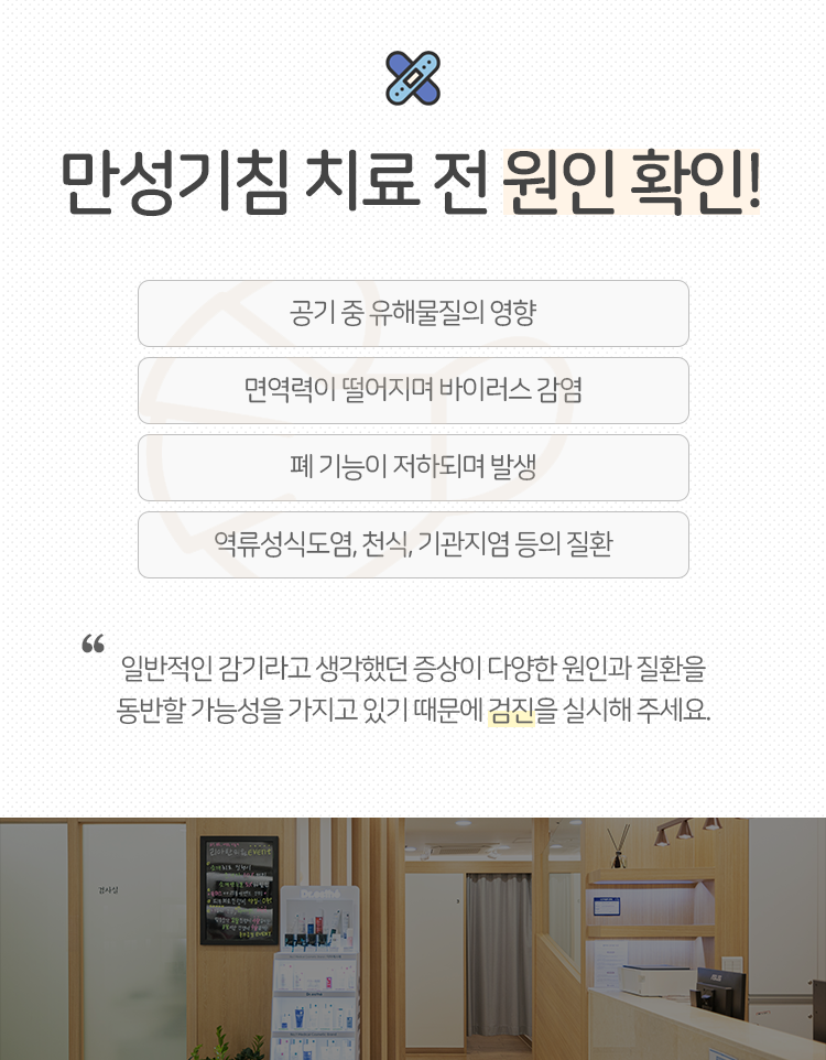 만성 기침이 발생하는 원인은 다양하다보니 단순히 이것을 호흡기 질환의 하나로만 국한하여 보기는 어렵다고 말씀을 드렸습니다. 대표적인 원인으로는 감염 이후 남아있는 바이러스의 영향이 있겠지만 그 외에도 폐 기능 자체가 저하되어 기저 면역력이 약해진 경우를 주요 원인으로 꼽습니다.