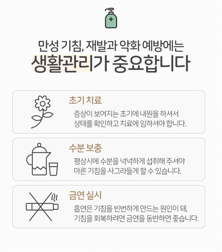 기침이 멈추지 않고 오랜 시간 지속된다면 이는 일상생활의 질을 급격히 떨어뜨리는 다양한 문제들을 불러오게 됩니다. 특히 밤마다 심해지는 기침은 깊은 잠을 방해하여 심각한 수면 장애를 초래하게 되는데 이는 신체의 회복력을 저하시키는 원인이 된다고 말씀을 드렸습니다.