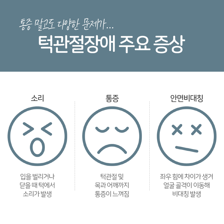 하지만 통증이 발생하는 부위가 비단 목과 어깨에만 국한되지 않고 귀 앞쪽의 턱 주변까지 뻗어 나가거나 입을 벌릴 때마다 턱에서 소리가 나는 증상이 동반된다면 상황을 보다 세밀하게 살펴볼 필요가 있습니다. 을지로입구역턱관절통증까지 나타난 상황이라는 것은 곧 턱관절장애에 의한 문제일 수 있다는 뜻으로 해석이 될 수 있겠습니다.