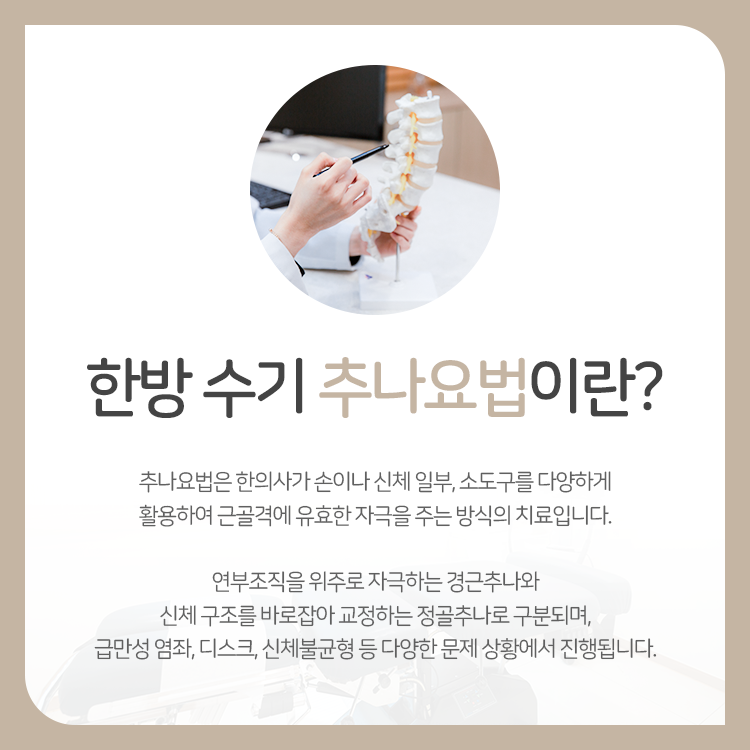 추나요법을 통해 불안정한 내부의 상태를 바르게 다스리는 효과를 기대하실 수 있을 것이라고 안내를 드립니다. 충무로체형교정에 도움이 되어 주는 추나요법은 한의사가 해부학적 이해도를 기반으로 하여 신체에 강한 자극을 전달하는 수기 치료인데요. 체형 교정이 필요할 때에는 관절이 가동할 수 있는 범위 이상의 강한 자극을 순간적으로 전달하면서 내부의 상태를 바로잡는 효과를 전해드리고 있다고 생각하시면 되겠습니다. 그리고 이 과정에서 자연스럽게 주변 굳어 있는 연부조직을 풀어 주는 등의 효과를 함께 확인하실 수 있을 것이라고 안내합니다.