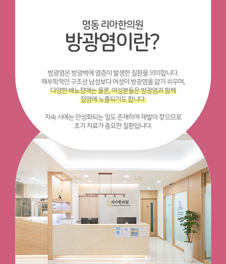 그 가운데에서도 주되게 이야기드리고자 하는 것은 방광염입니다. 방광염은 방광벽에 염증이 생겨나는 질환이라고 생각하시면 되겠는데, 주로 여성에게 흔히 나타납니다. 그러나 때에 따라서는 남성 역시 피해를 볼 수 있는 질환이기 때문에 문제 증상이 존재하고 있다면 의심을 거두지 말고, 적극적으로 상태를 확인하여 문제를 파악하고 치료까지 진행하기 위한 노력을 기울여 주어야만 하겠습니다.