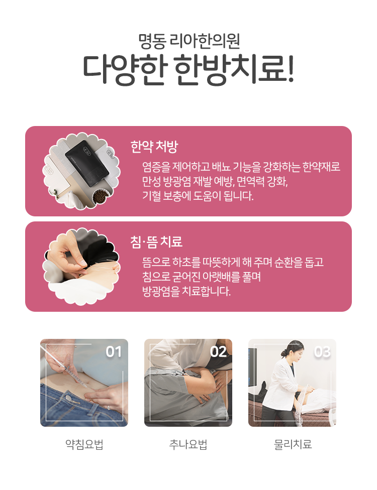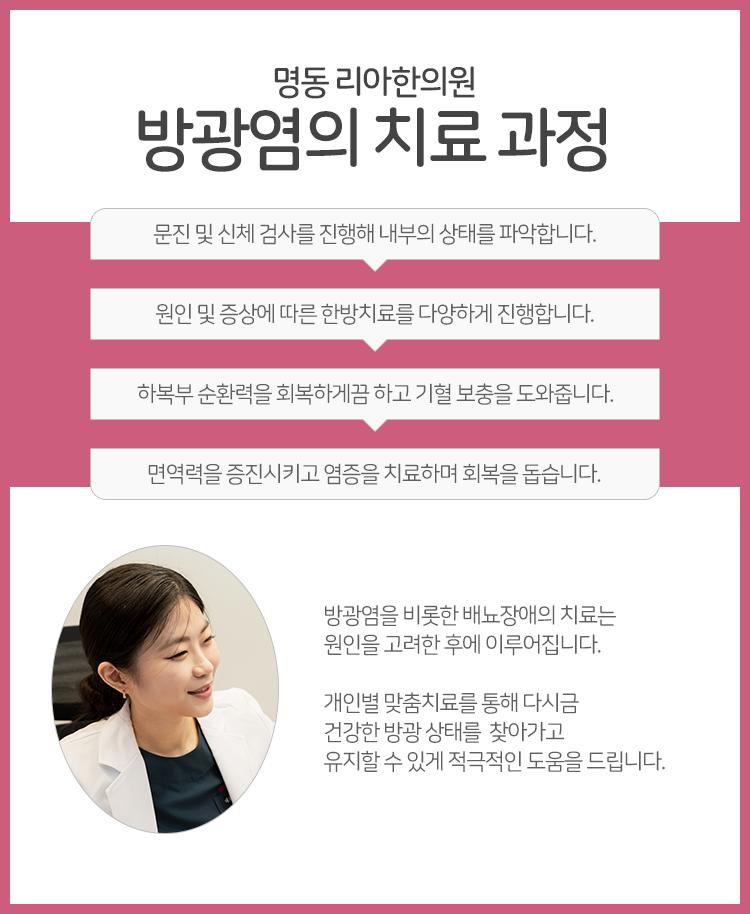 방광의 상태를 회복하여 다시금 건강한 상태를 유지할 수 있도록 하기 위해서라면 기혈을 보충하고 면역력을 강화시킬 필요가 있겠습니다. 이때 도움을 받아 보실 수 있는 방안이 한약 처방이라고 생각하시면 되겠는데요. 한약 처방은 내부적으로 부족한 기혈을 보충해 줄 수 있을 뿐만 아니라 장부의 허실을 고려한 처방을 진행하기 때문에 면역 체계를 안정화시킬 수 있습니다. 그리고 이밖에도 종로빈뇨 및 질환 치료를 위해 침이나 약침치료 등 여러 가지 한의학적인 치료를 병행해 나가게 된다면 보다 내부의 상태를 안정적으로 회복해 나갈 수 있을 거라는 말씀을 전해드립니다.