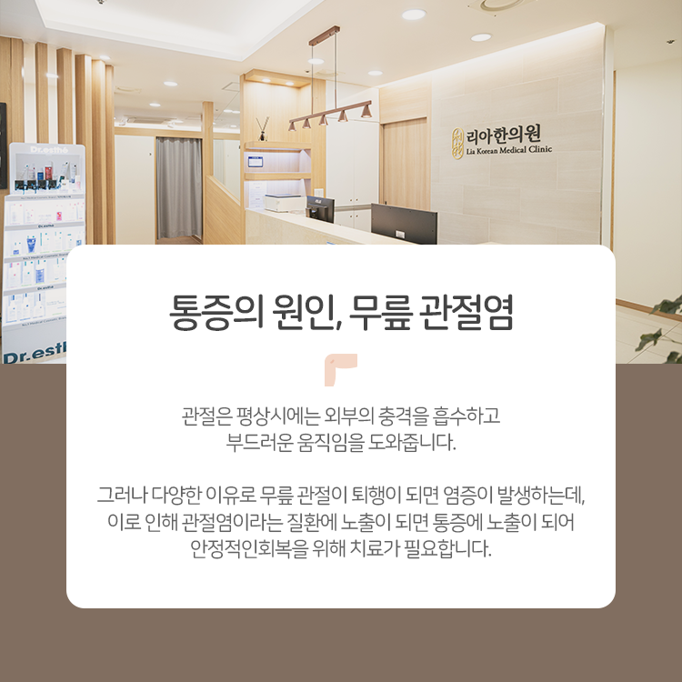 무릎 쪽을 위주로 연골이나 근육, 인대처럼 관절을 구성하고 있는 하위요소들에 이상이 생겨나게 되면 차츰 연골이 마모되고 관절이 손상을 입게 될 수 있는데요. 이로 인해 뼈와 뼈가 직접적으로 부딪히며 염증이 발발하여 명동퇴행성관절염이라는 문제에 노출될 수 있는 것입니다.