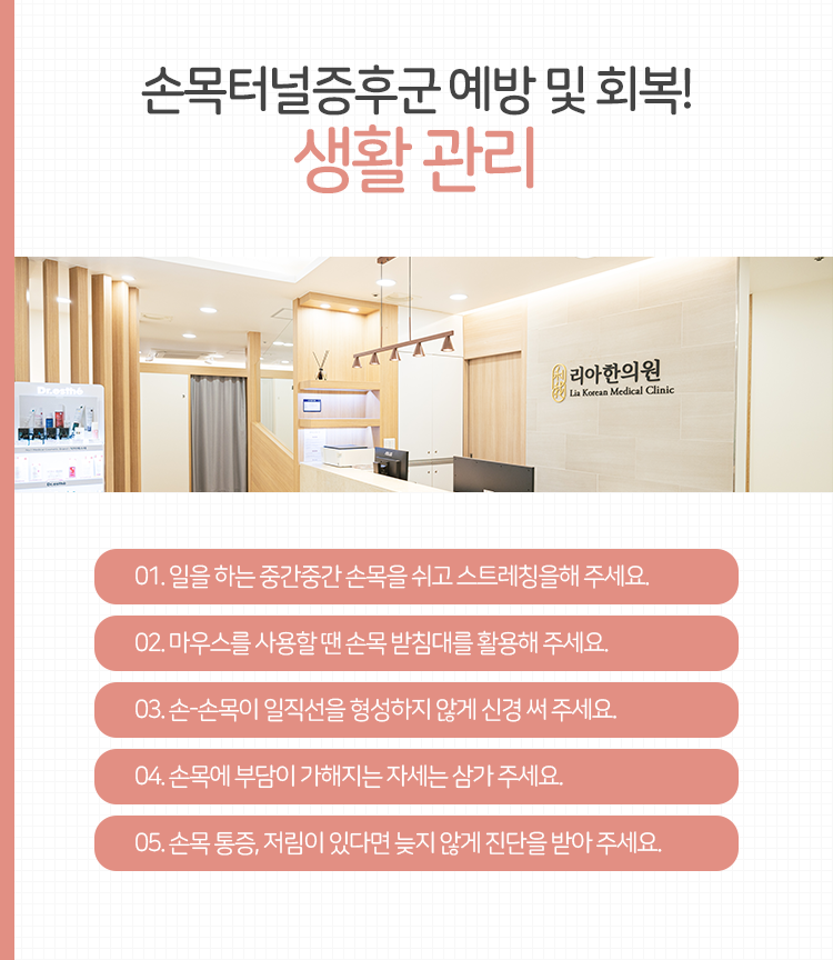 초기에는 일시적인 문제일 것이라는 판단에 개의치 않고 넘어가셨겠지만, 시간이 흐를수록 심상치 않은 상태를 느끼고 계실 수 있는데요. 이런 상황은 을지로수근관증후군치료가 필요한 문제일 수 있습니다. 명동리아한의원은 다양한 통증질환의 치료를 도와드리고 있는 만큼, 손목과 손의 문제로 정상적인 생활에 어려움을 겪고 있다면 내원을 진행해 보시길 바랍니다.
