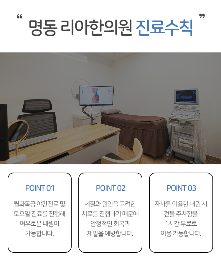 하지만 때때로 쥐어짜는 듯한 고통이 계속되어 정상적인 생활을 해내는 것마저도 버겁다고 생각이 되는 일도 있습니다. 이런 때에는 시청역생리통 치료가 필요한 상황이라고 인식해 주셔야 하는데요. 명동 리아한의원에서는 여성분의 상태를 고려하여 통증을 진정시키고 건강한 회복에 도움이 되어 드리고자 노력을 기울이고 있습니다.