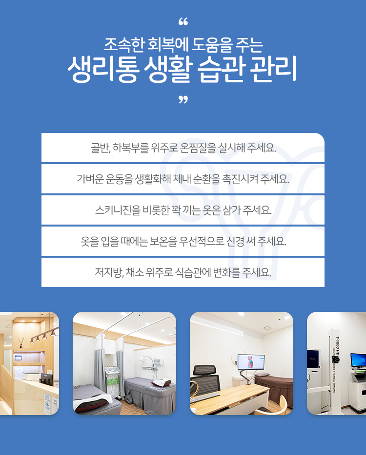 동시에 생활 습관도 개선될 필요가 있습니다. 규칙적인 운동으로 혈액순환을 개선해 주시고 스트레스를 풀어 주는 것도 중요한 일이라 할 수 있겠습니다. 또한 스트레스 관리를 병행해 주심과 더불어 필요 시 따뜻한 찜질팩을 아랫배에 대고 있는 곳에 도움이 되어 줄 수 있습니다. 다만 과도하게 뜨거운 것은 오히려 염증 반응을 악화시키는 경우도 있기에 주의하시기를 바랍니다.