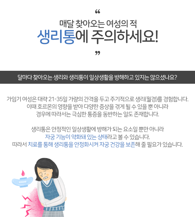 생리통은 여성이라면 누구나 겪게 될 수 있는 흔한 증상이라 알려져 있습니다. 그렇다보니 아픔이 있어도 다들 경험하는 것이라는 생각에 참고 넘어가는 일도 있는데요. 그러는 사이 상태가 악화될 수 있습니다. 따라서 심한 통증이 생활에 지장을 주고 있다면 상태를 확인하고 치료를 위해 움직여 주셔야 하겠습니다.
