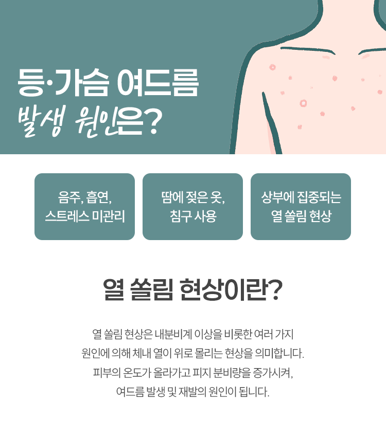 많은 분들이 등, 가슴 여드름은 눈에 쉽게 띄지 않는다는 이유로 가볍게 여기는 경향을 보이고는 하십니다. 그러나 이는 잘못된 생각이라는 점에 대해서 이야기드리고 싶습니다. 관심을 가지고 치료에 임하지 않는다면 점차 심각한 문제가 될 가능성이 높아진다는 것을 고려해 주시기를 바라겠습니다. 하지만 반대로, 관심을 가지고 관리해 나간다면 다시 건강한 피부를 되찾는 데 기여할 수 있음도 사실입니다. 당장에는 심각성이 눈에 띄지 않더라도 미리미리 관리하시면서 깨끗한 피부를 찾아 유지할 수 있도록 노력해 보시면 되겠습니다. 감사합니다.