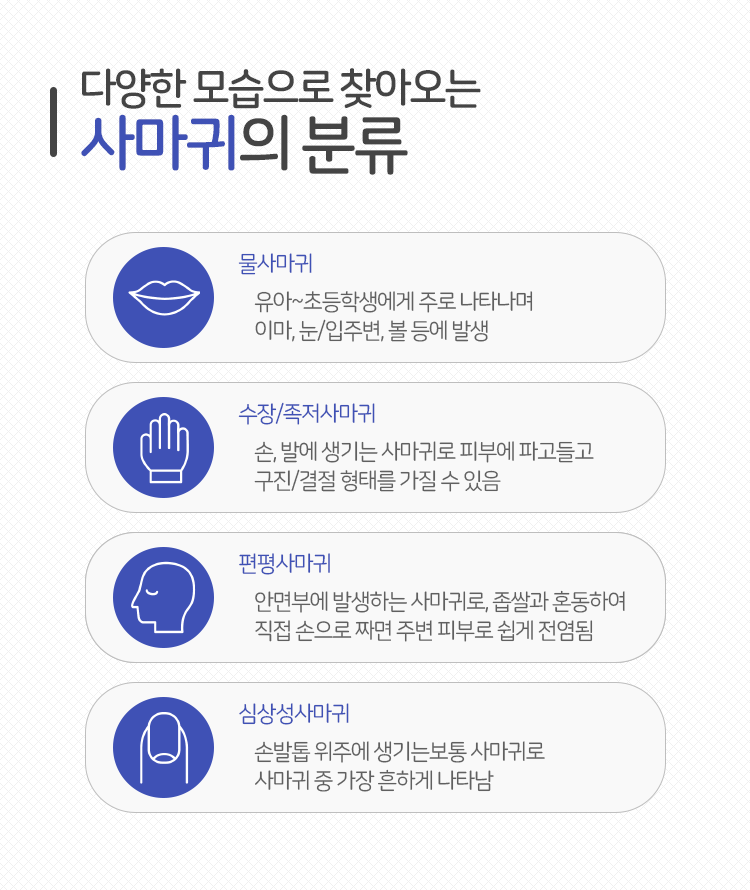 사마귀는 면역력 약화로 인해 발생할 수 있는 질환입니다. 그 이유는 사마귀가 인유두종 바이러스인 HPV 감염에 의해 나타나는 양성 종양이기 때문이라 생각하시면 되겠습니다. 발생하게 되는 위치는 개인마다, 상황에 따라서 달라질 수 있습니다. 주로 이야기드릴 수 있는 것으로는 편평사마귀, 심상성사마귀, 물사마귀가 있는데 이들만 하더라도 발생 위치가 제각기 다릅니다.