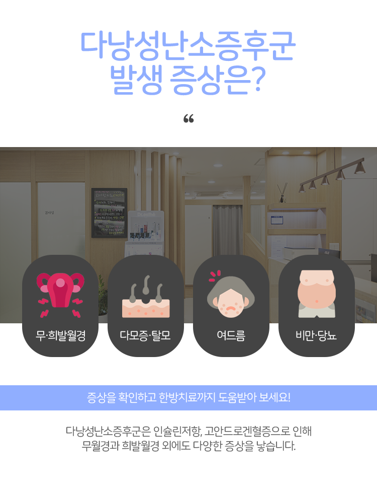 그러나 이러한 노력에도 불구하고 문제가 계속 되풀이됨과 더불어 여드름이 심해지는 등 다른 증상까지 같이 찾아올 수 있습니다. 종로무월경치료한의원에서는 이런 증상이 찾아오는 원인으로 다낭성난소증후군을 먼저 의심해 보아야 한다고 강조하는 말씀을 전해드리고 있습니다. 다낭성난소증후군은 가임기 여성에게 흔한 질환인 만큼 누구나 그 대상이 될 수 있기에 더욱 주의해야 한다고 말씀드리고 싶었습니다.