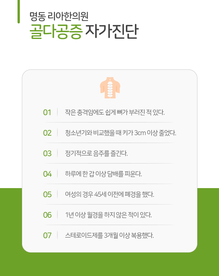 영양 부족이나 운동 부족, 생활 습관도 문제의 일부로 작용하게 됩니다. 건강한 생활을 영위하지 못한 분들은 나이와 관계없이 골다공증으로 인한 피해를 겪게 될 수 있는 것이라고 생각을 해 주시면 되겠습니다. 그렇기에 건강한 생활 습관을 먼저 형성할 수 있도록 신경 써 주실 것을 권유드립니다.