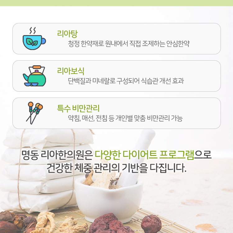 찐 살은 다시 빼면 된다고 생각하셨을 테지만 실제로는 살을 빼는 과정이 수월하고 순탄하지만은 않아, 어느 순간부터는 살, 다이어트라는 단어만 떠올려도 큰 스트레스를 받게 되기도 합니다. 오늘은 이런 고민을 가지고 계실 분들께 시청역다이어트병원 명동 리아한의원은 어떤 방식으로 도움을 드리고 있는지 설명해 드리려고 합니다.