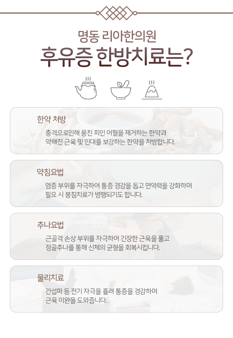 사고 직후 신체에 이렇다 할 변화가 느껴지는 것도 아닌 데다가 외관상 살펴보았을 때 출혈과 같이 드러나는 손상이 존재하는 것도 아니라면 상황을 가볍게 여기게 되기 쉬웠어요. 심지어는 다음날 근육통이 찾아와도 일시적인 현상일 것이라고 간주한 채 방치하는 경우가 상당수 존재할 수 있다는 것이었죠. 하지만 명동 리아한의원에서는 이것이 교통사고 후유증일 수 있기 때문에 늦지 않게 조치를 취해야 한다고 말씀을 드렸었어요.