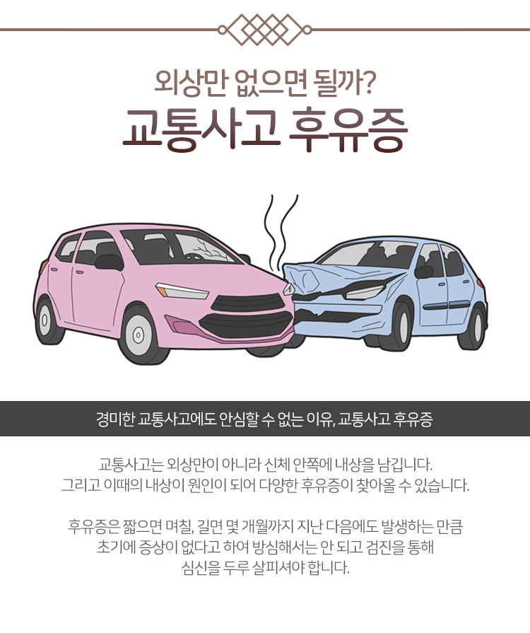 생각하시는 것보다 교통사고 후유증은 무증상인 채로 상당 시간이 흐르는 경우가 많기 때문에 대처가 지연될 수 있었는데요. 후유증이 찾아온 다음 관리를 진행하면 된다고 생각하실 수 있었지만 이는 바람직하지 않았어요. 이미 시간이 흐른 만큼 내부 손상은 악화되어 있을 가능성이 존재하기 때문이었죠. 게다가 보통 지연성 후유증의 경우 호르몬 영향으로 잠복기를 갖는 것이기 때문에 당장의 증상이 존재치 않는 게 이상이 없는 것이라고 판단하시는 건 바람직하지 못했었어요.