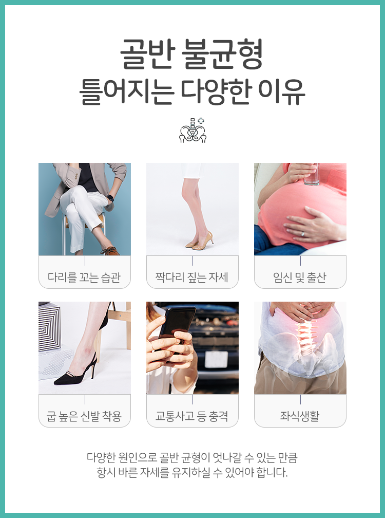 이러한 골반 틀어짐의 주요 원인은 다름 아닌 현대인의 특정 생활 습관에서 비롯되는 경우가 많습니다. 과거에 비해 신체 활동량이 현저히 줄어들고 장시간 앉아서 생활하는 시간이 길어짐에 따라 잘못된 자세를 취하는 경우도 많이 있는데요. 이것이 골반 틀어짐을 유발할 수 있습니다. 구부정한 자세 및 다리를 꼬는 습관이나 한쪽으로 기대 앉는 습관까지도 골반 비대칭의 원인이 되고는 했습니다. 이외에도 운동 부족 등 여러 가지 원인이 정상적인 골반의 균형을 흐트러뜨리는 원인이 될 수 있는 영역으로 작용하게 된다고 말씀을 드렸습니다.