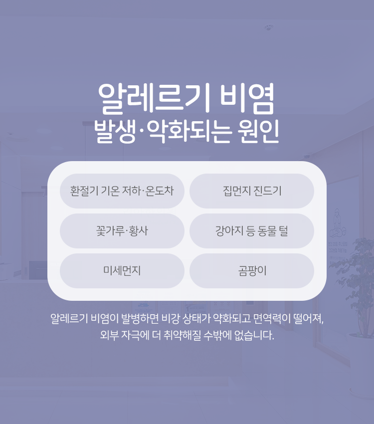 비염은 비강 내부 발생한 염증으로 인해 콧물, 코막힘, 재채기와 같은 대표적인 증상과 부가적인 증상을 유발하는 질환이라고 할 수 있겠습니다. 크게 알레르기/비알레르기성으로 구분이 된다는 것이 특징입니다. 다양한 증상이 찾아오는 데다가 여러 가지 요소로 악화가 되는 질환인 만큼 적극적으로 치료에 임하지 않는다면 상태는 손쉽게 뒤흔들리게 될 수 있습니다. 그렇기 때문에 자세히 상황을 파악하여 건강하게 회복을 도모할 수 있도록 노력을 기울여 주실 필요가 있음을 당부드리고 싶었습니다.