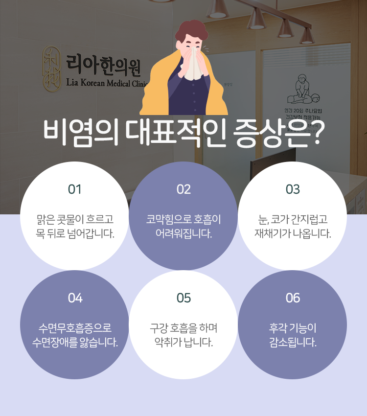 일시적으로 찾아온 감기라는 생각에 대처하지 않고 넘어가다가 회복되지 않은 채 지속이 되면서 이것이 비염은 아닌가 의심을 하게 된다면 그때부터 불안까지 고조되며 더욱 괴로우셨으리라는 생각이 듭니다. 명동 리아한의원에서는 이번에 시청역비염이 어떤 질환인지 그리고 본원에서 이루어지고 있는 치료까지 같이 안내해 드릴 예정이오니 비염이 의심되고 걱정되는 상황이라면 참고하여 관리할 수 있게 노력해 주시기를 바라도록 하겠습니다.