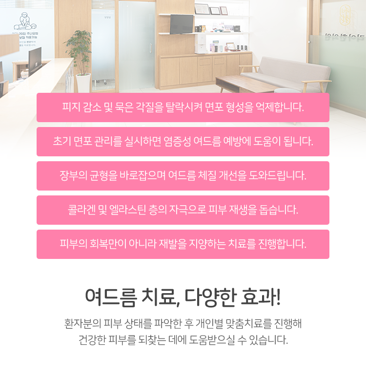 또, 한약 처방은 잦은 빈도로 재발하여 피부의 상태를 점점 더 악화시켰던 여드름의 존재가 신경 쓰일 때 진행이 되는 치료 방안이었는데요. 시청역피부과 한약 처방을 지속적으로 진행해 주신다면 내부의 상태를 다스리면서 재발의 가능성, 빈도를 낮추는 데 도움을 전해 줄 수 있겠습니다.